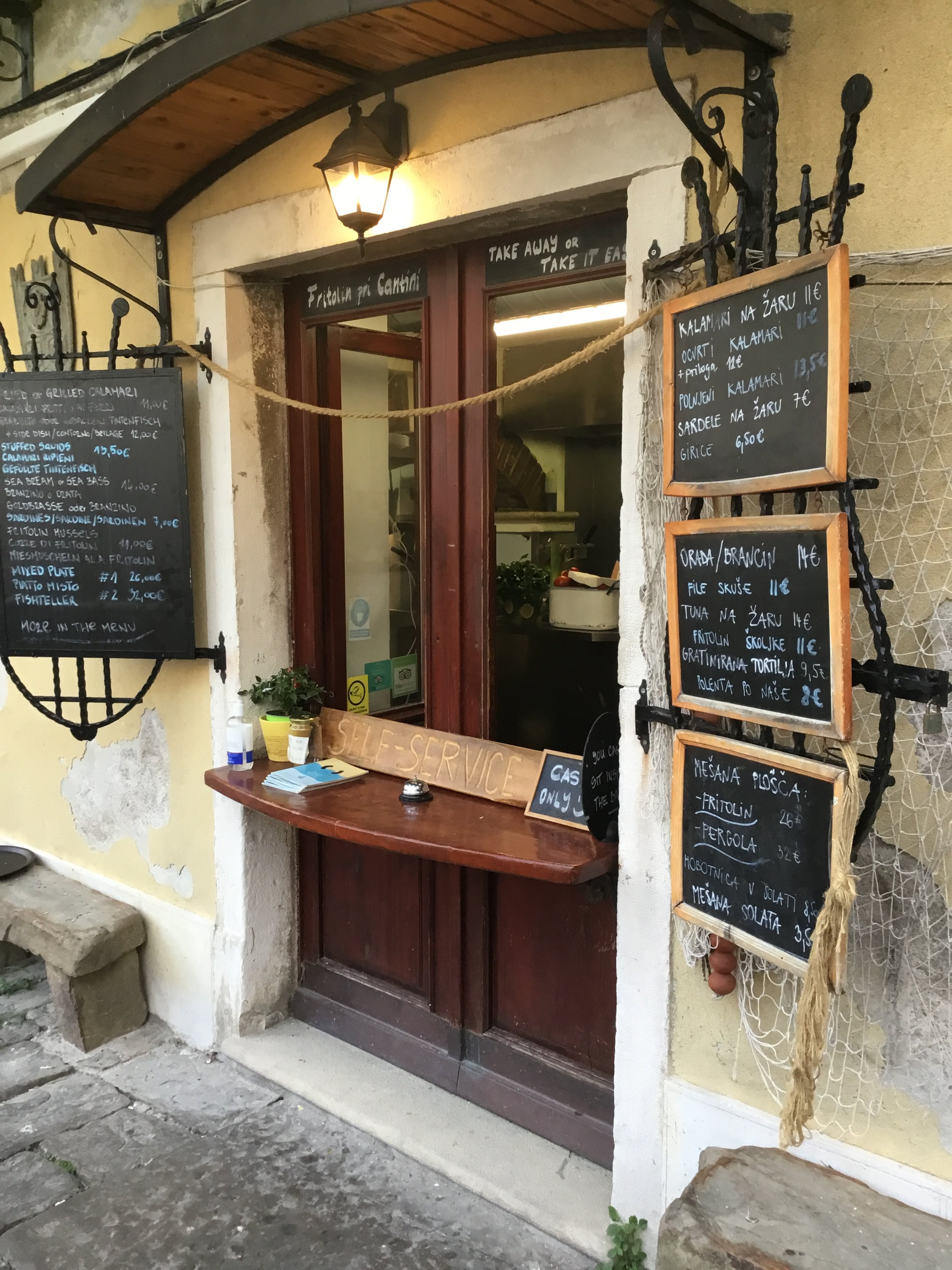 Our favourite restaurant was Cantina Klet (0386 5 673 32 75), set in the gorgeous little square, Trg 1 Maja. You may have to wait a while for a table, then you take a look at the menu which is on a blackboard and order at the self-service window, they will give you a shell with your number on. The waiters are there solely to take and serve orders for drinks, definitely order the local wine or beer. Don’t be put off by the idea of self-service etc, this is just the way they do it, you won’t be disappointed, the seafood is delicious, the setting romantic, and the price is good.